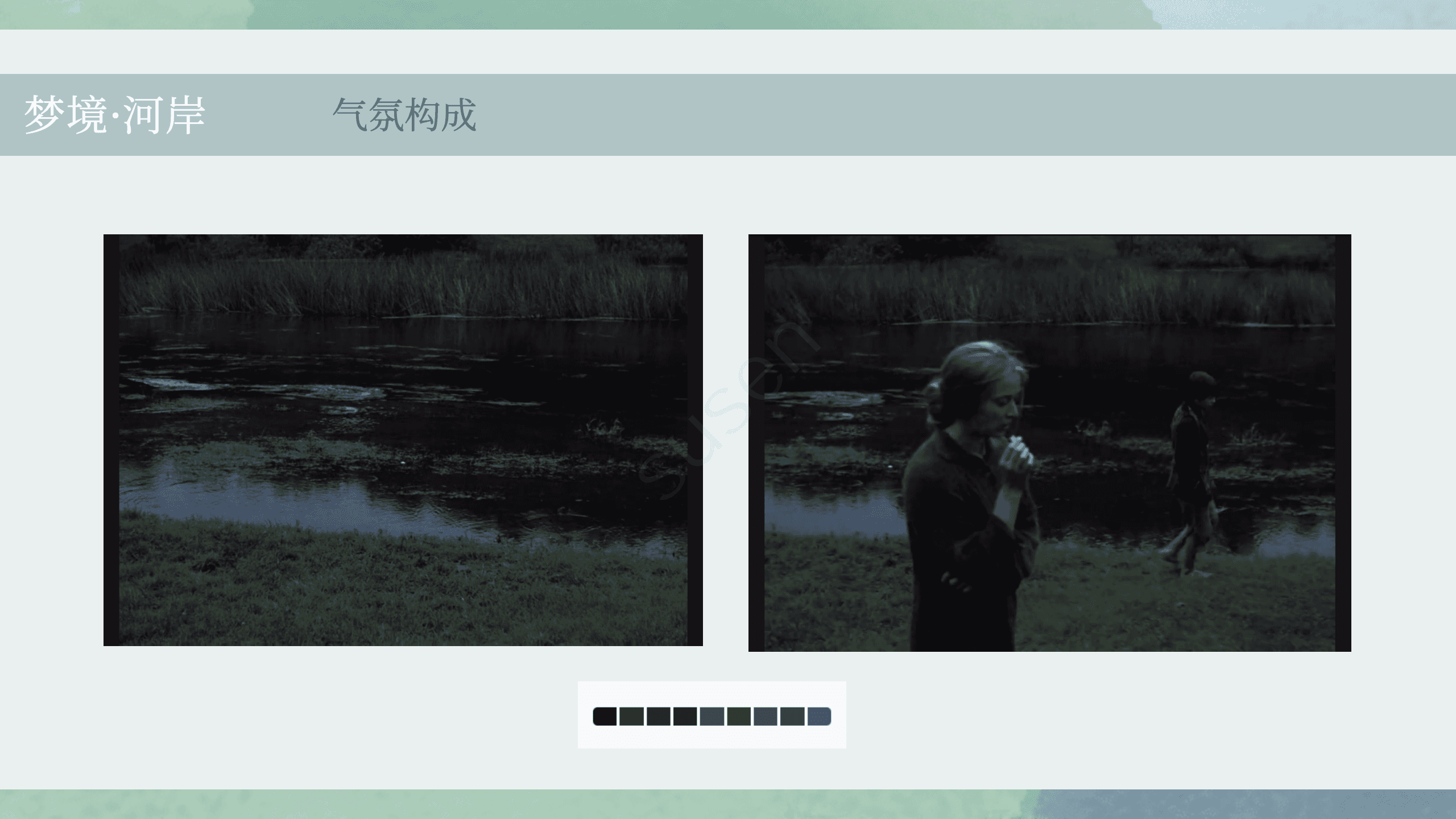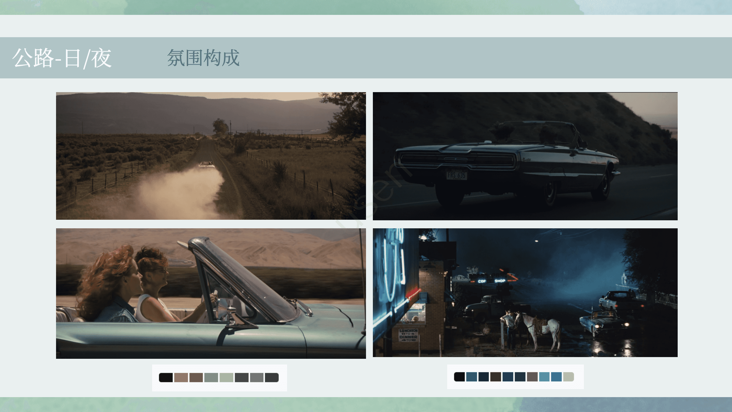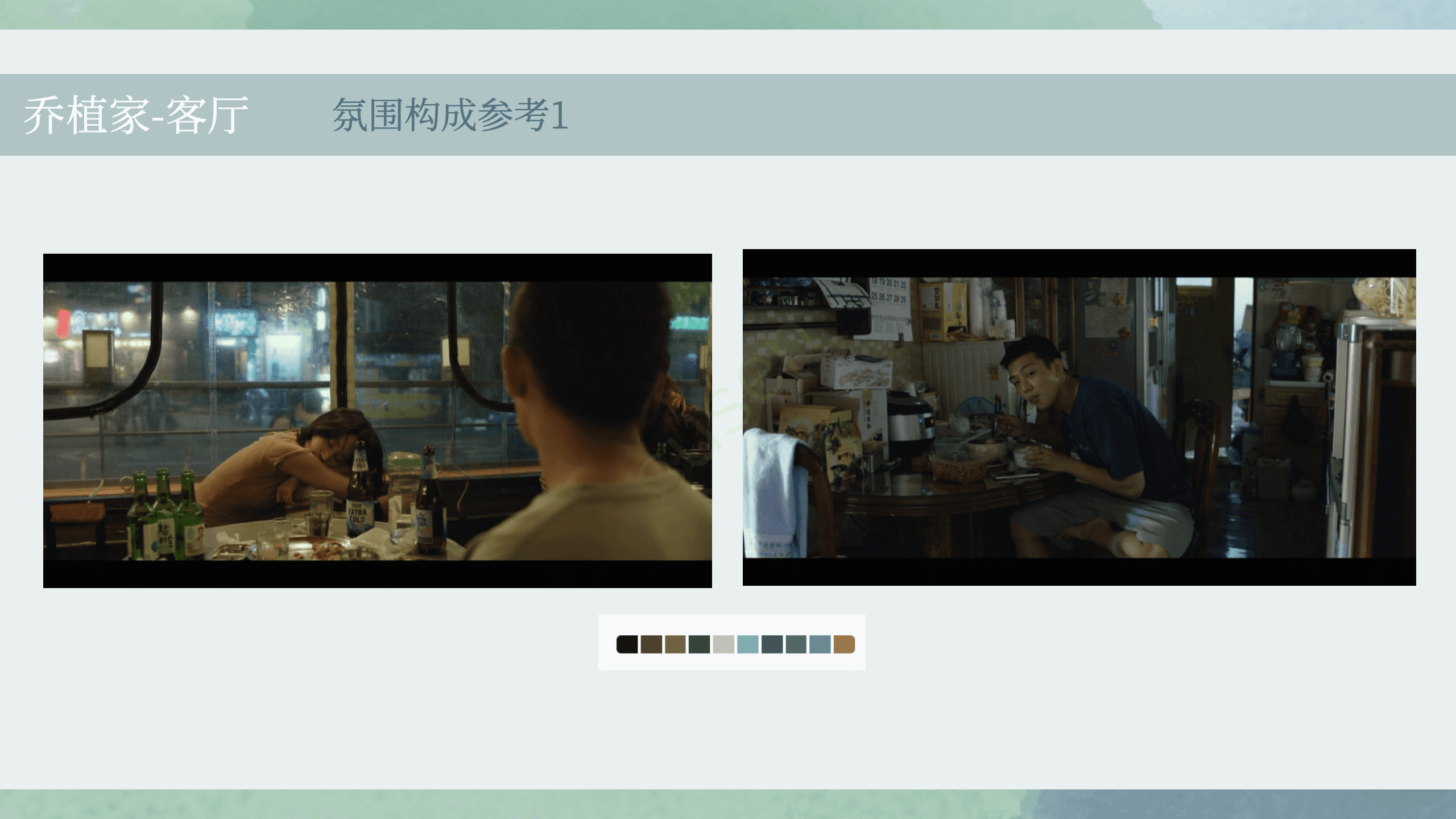 影片以蓝绿冷色为主基调(约50%),构建整体压抑、迷失的情绪底色;