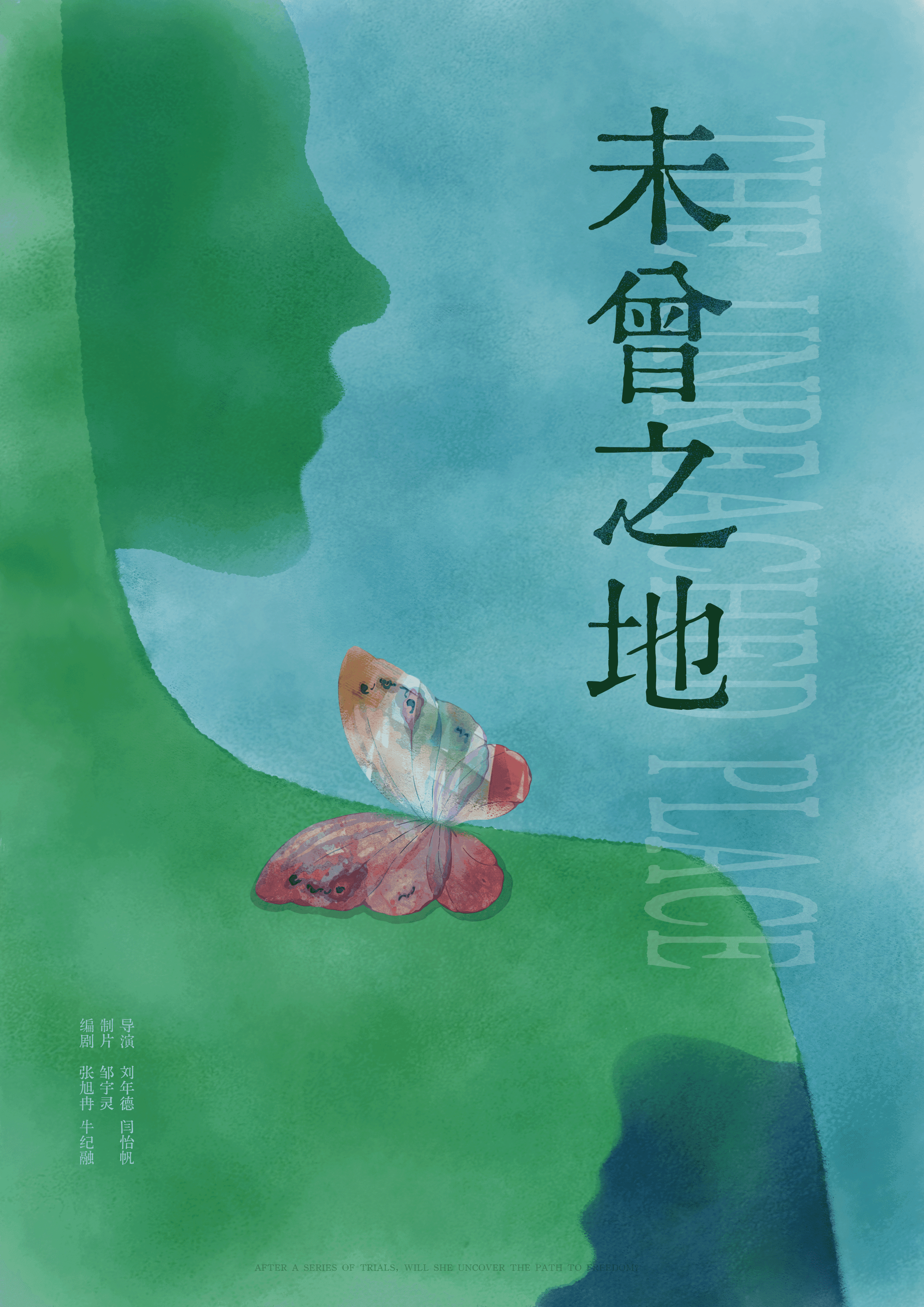 在色彩上,海报延续影片整体的蓝绿冷色基调,营造疏离、压抑的情绪氛围;同时通过蝴蝶的暖色对比,形成视觉“破口”,强化情感张力与传播记忆点。